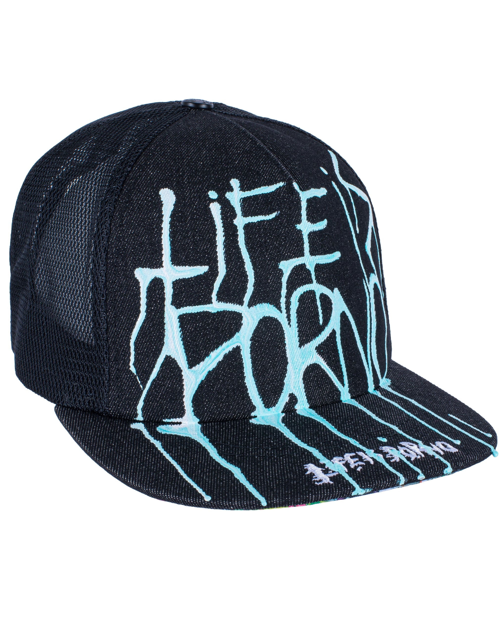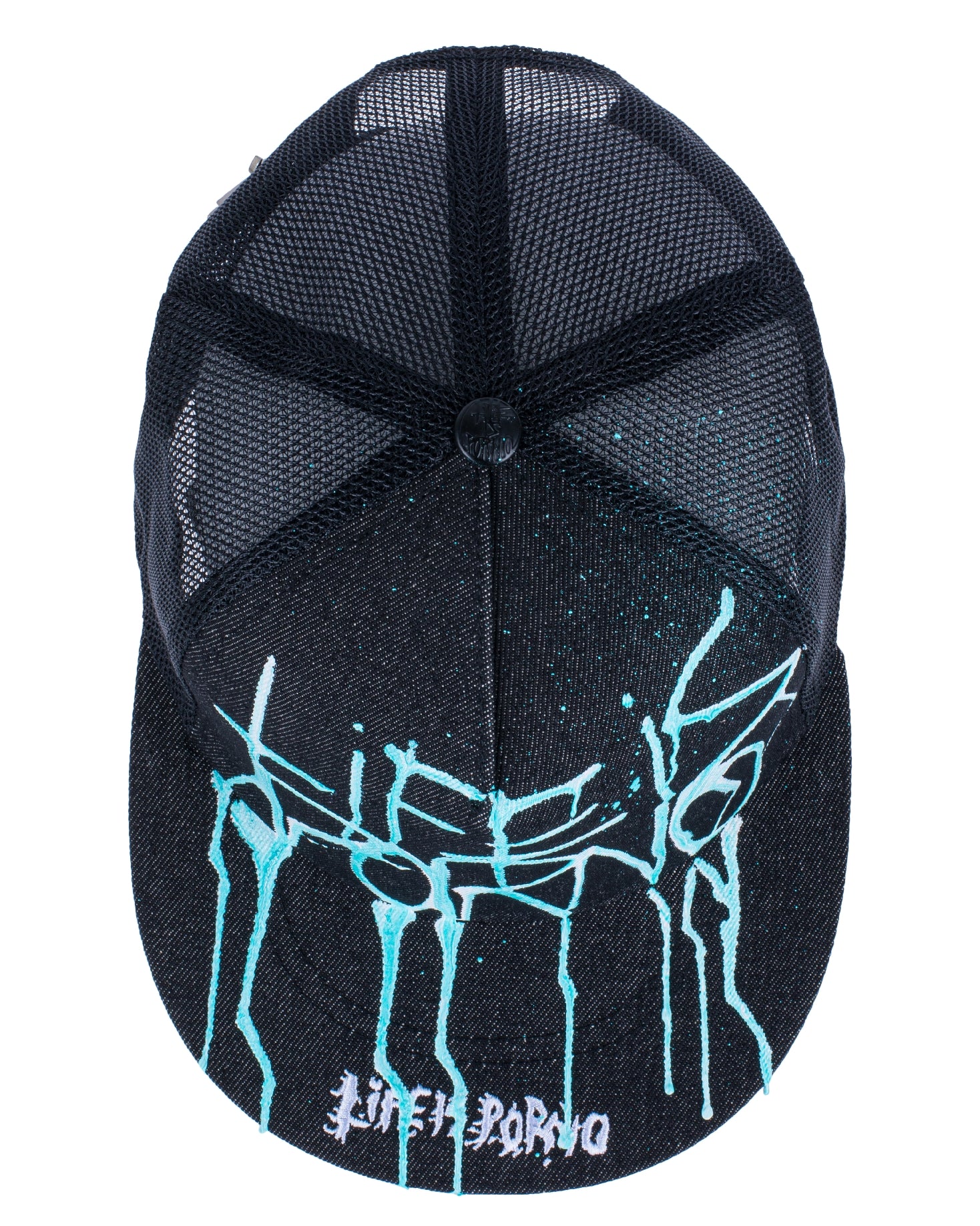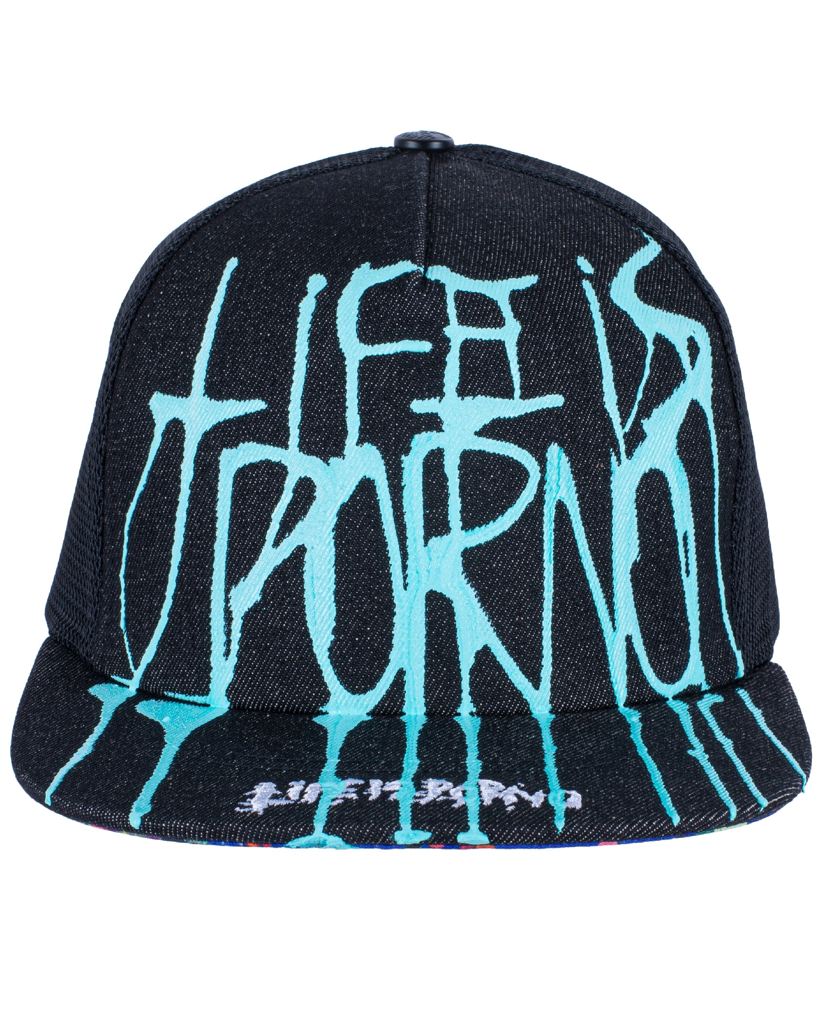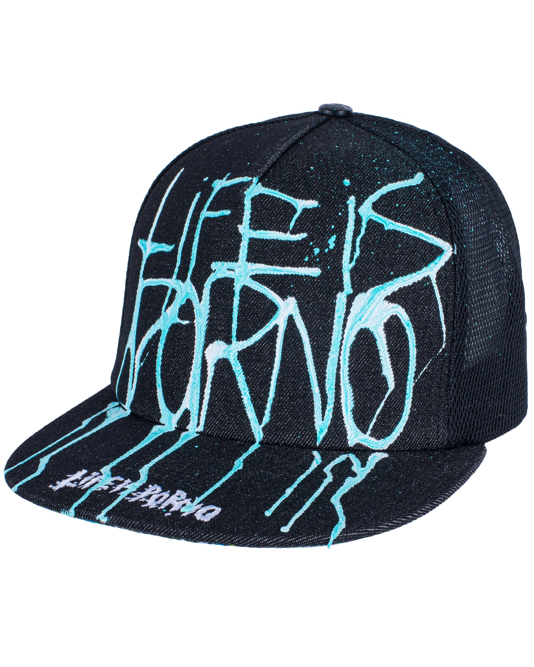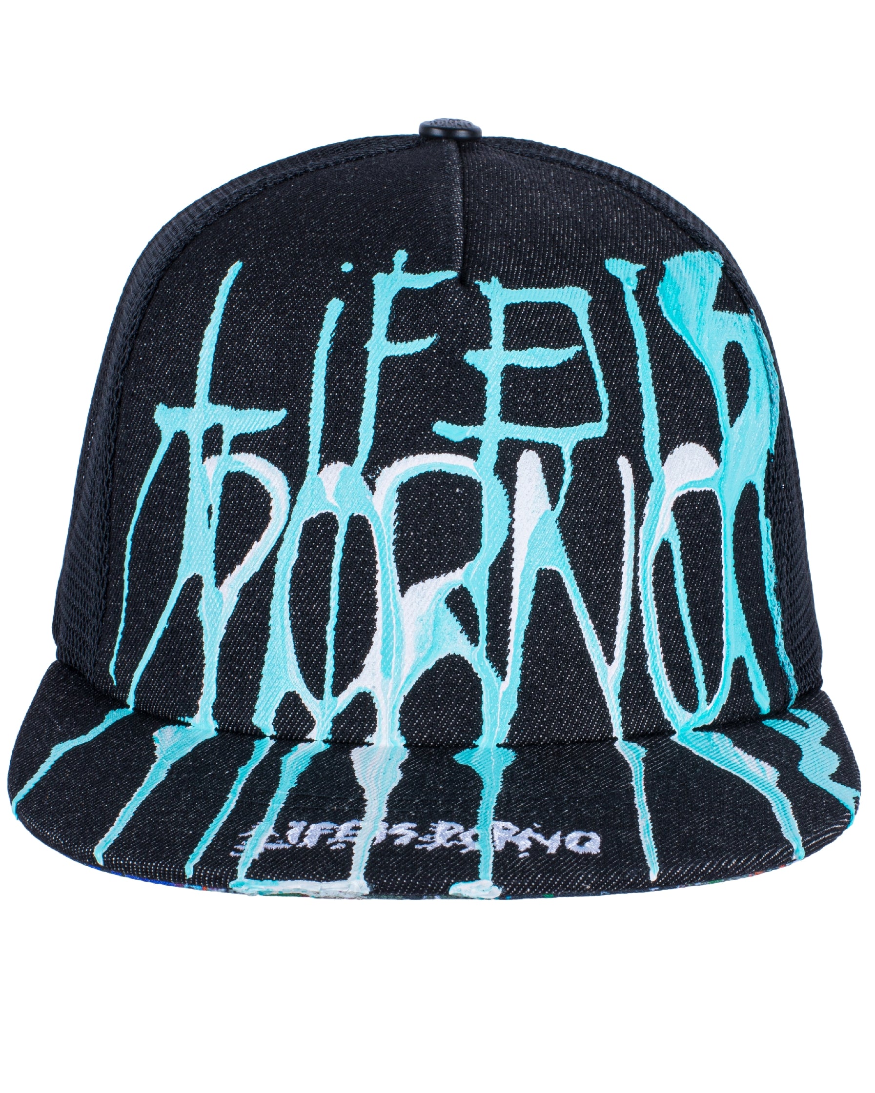Flatcap se síťovinou vzadu, 3D výšivkou „LifeisPorno” vpředu a barevnýma details pod kšiltem. Nechybí ani „LIP” pin po straně a zapínání vzadu.