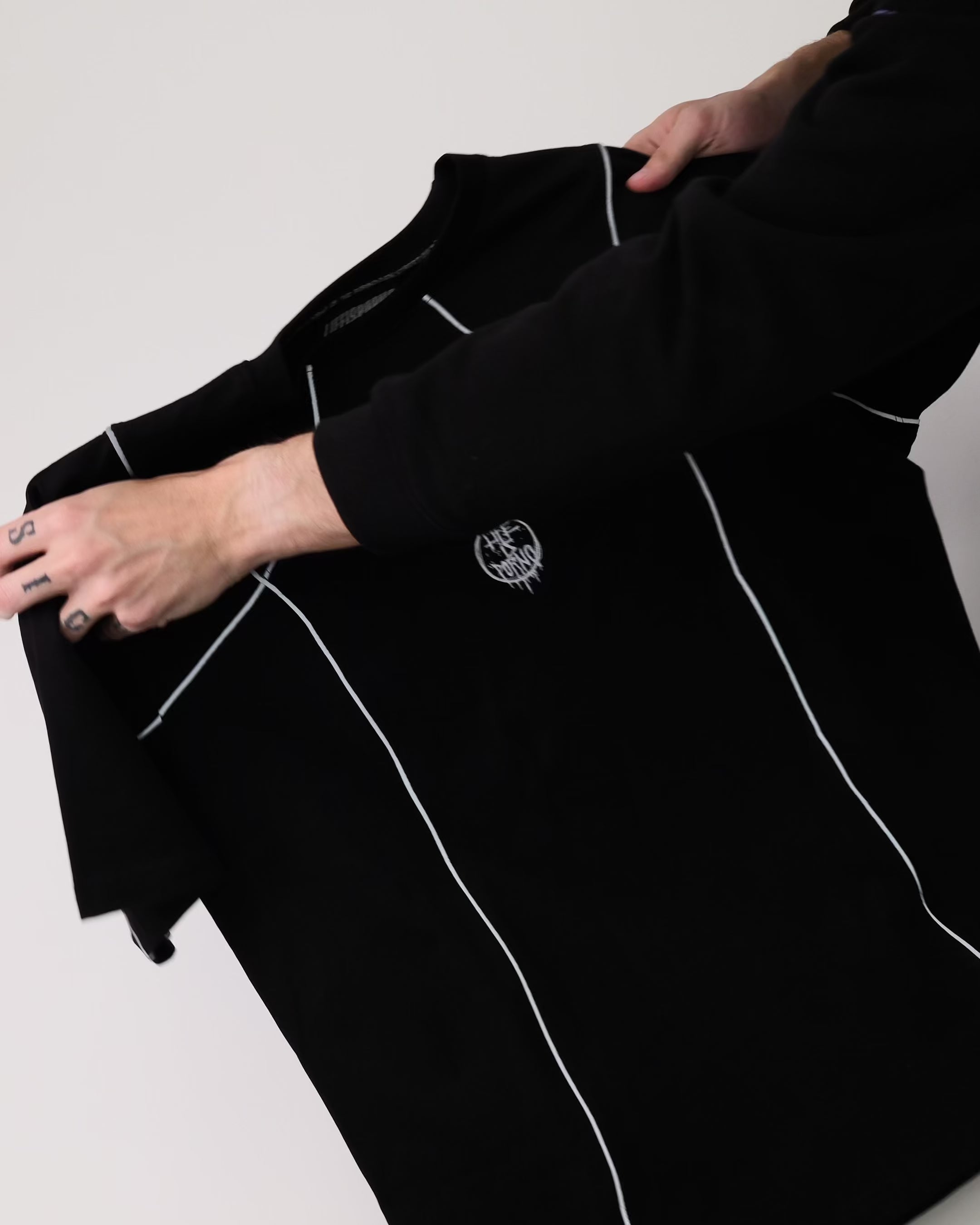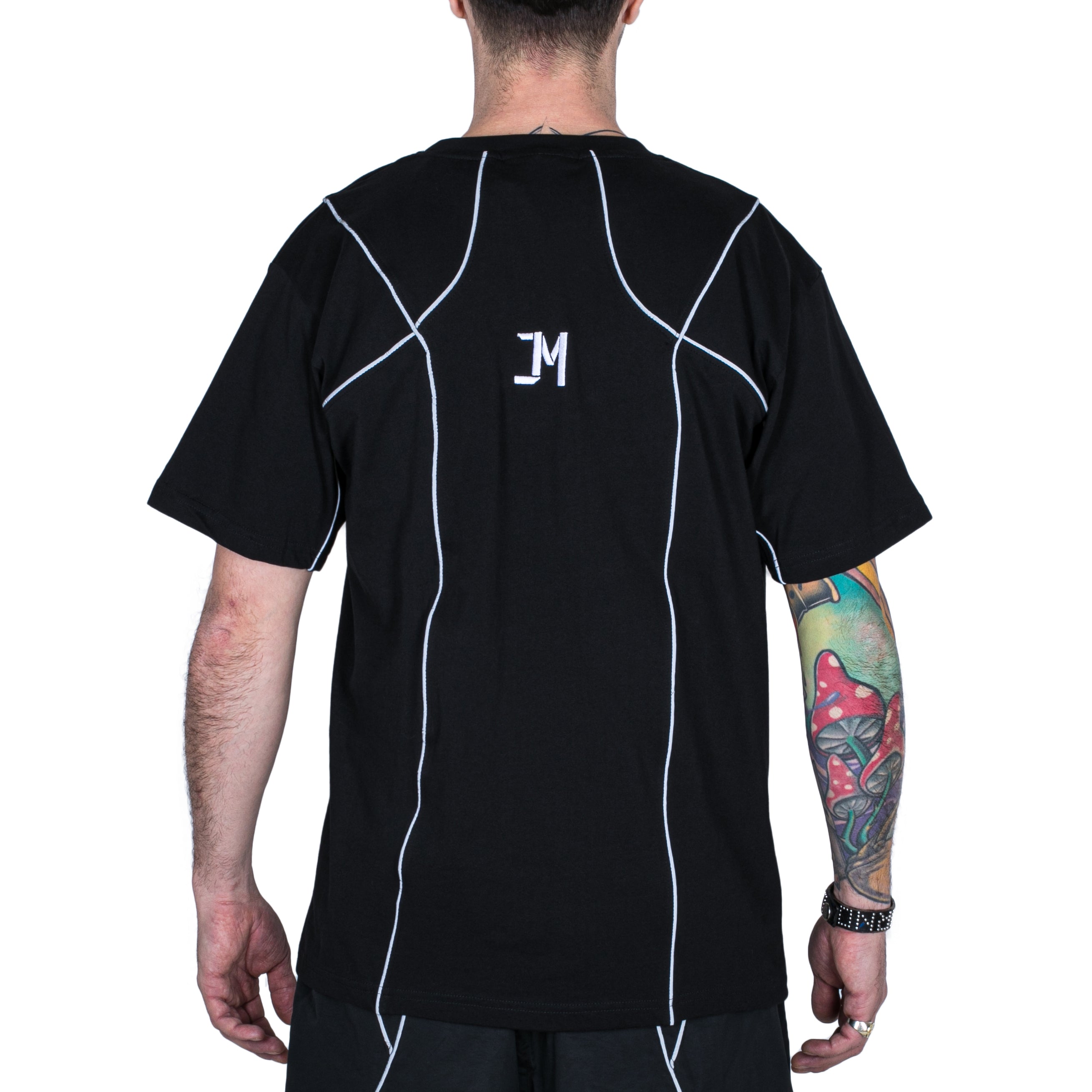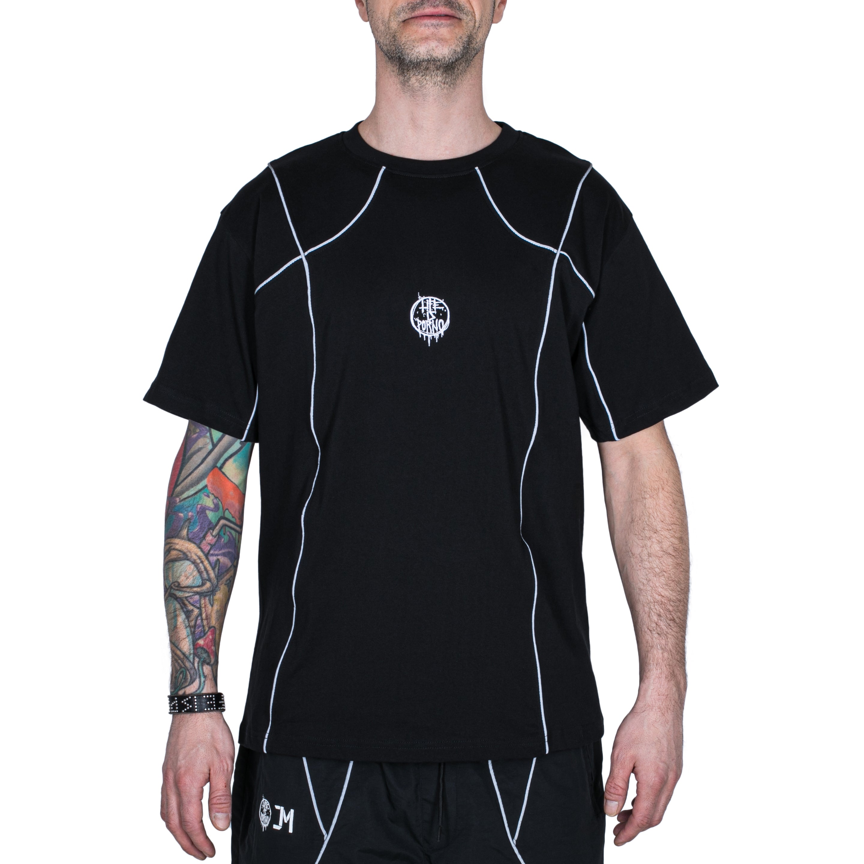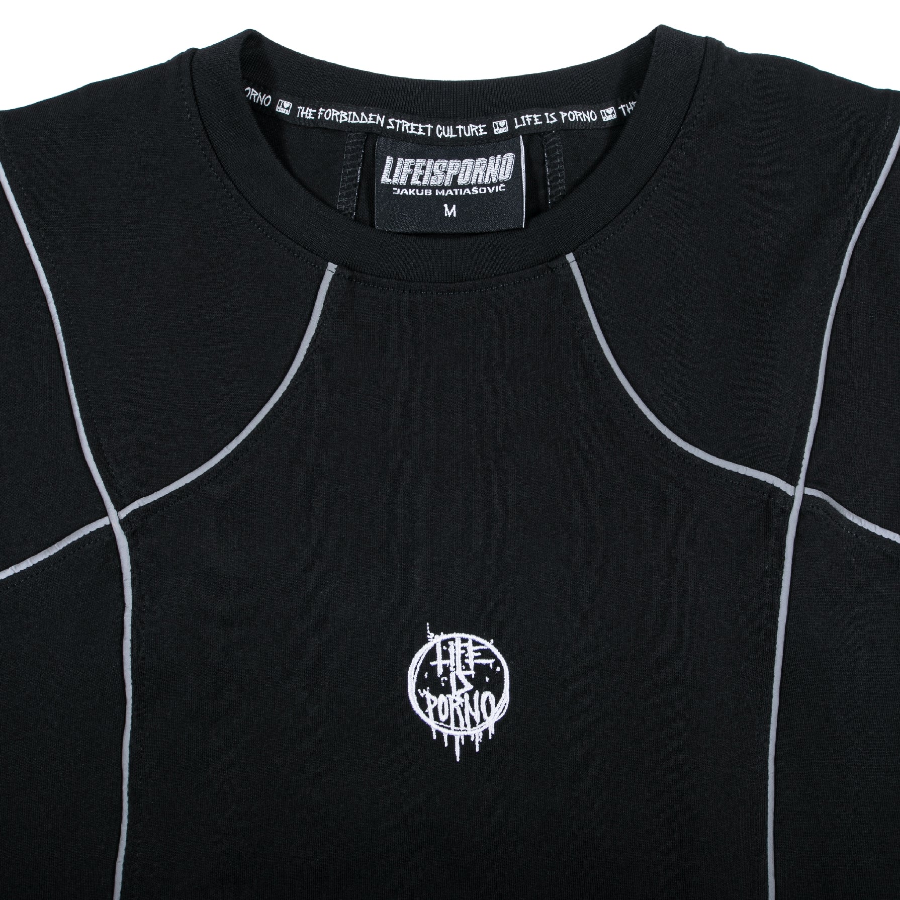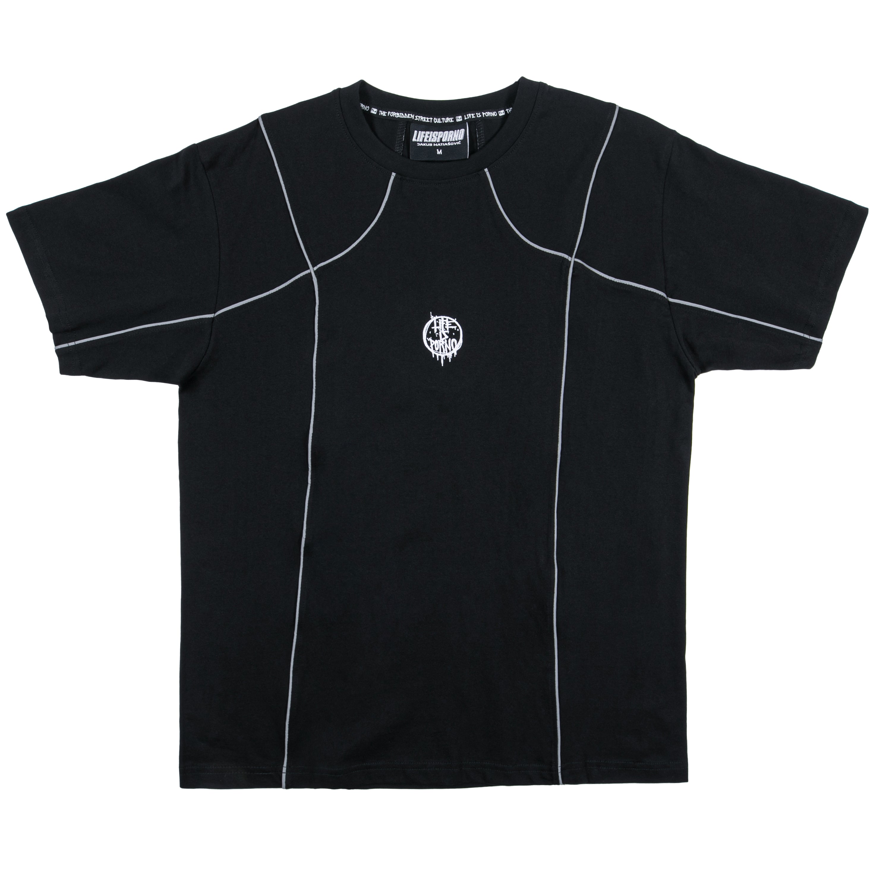 Na tričku najdeš signature detail týhle kolaborace v podobě reflexních proužků a dvě loga na jednom kousku - naše circle logo vpředu a Jakubovo na zádech.