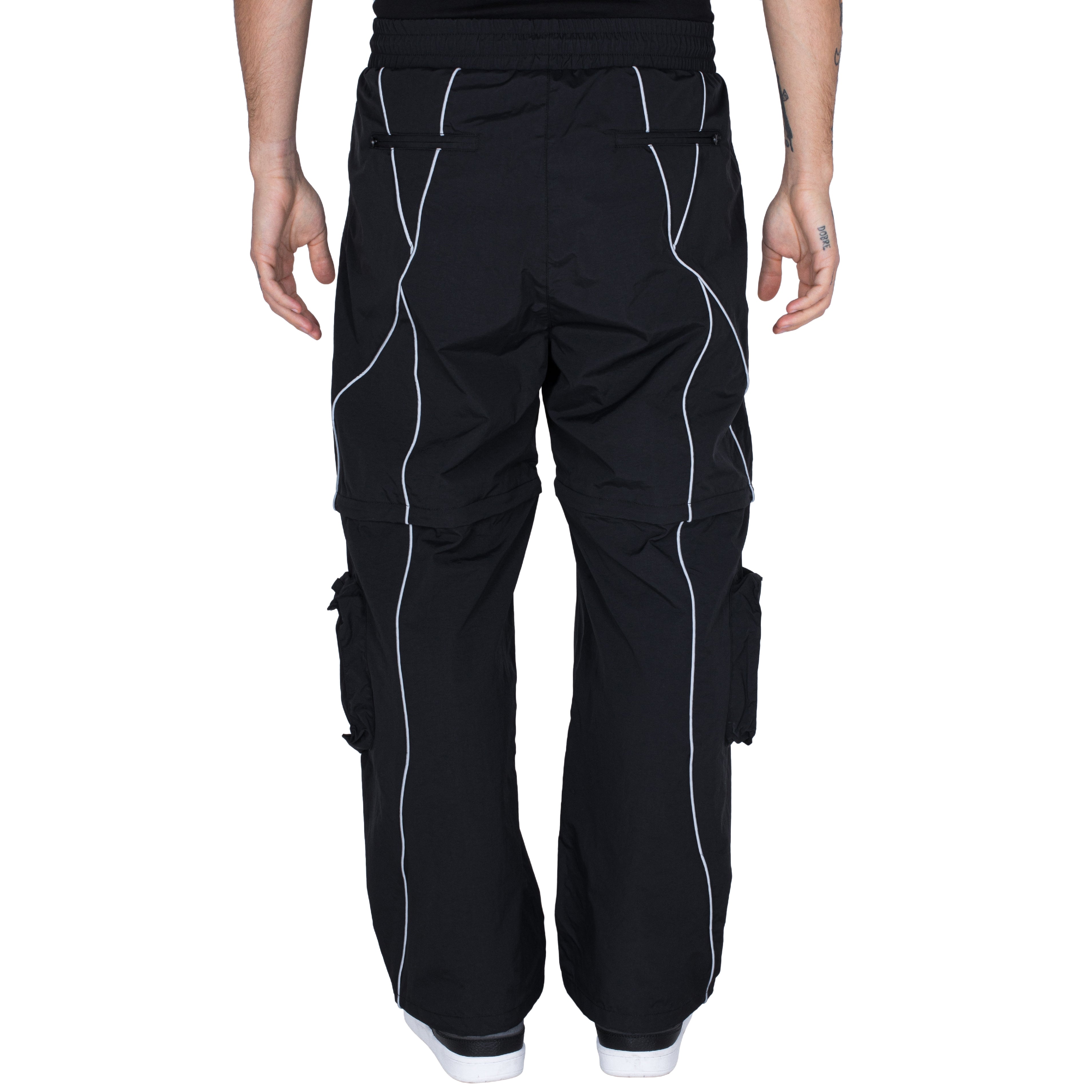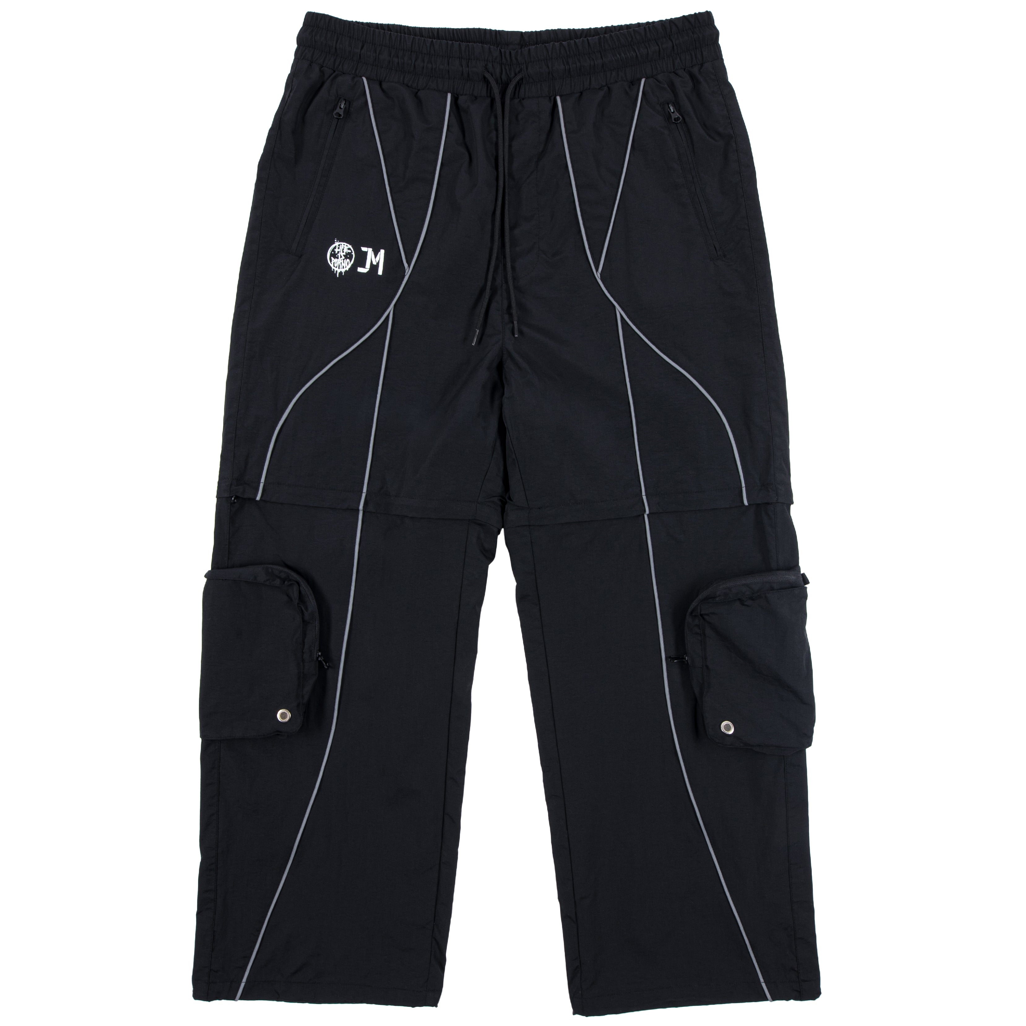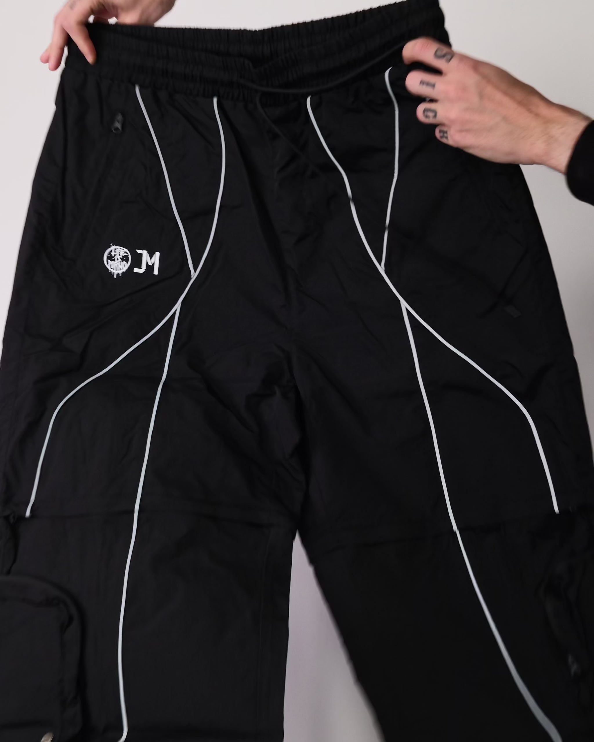 Reflexné pásiky, čo sú signature detail celej kolekcie, idú po bokoch až dole. A odrážajú svetlo aj tvoju originalitu. Materiál je nepremokavý šušťák podšitý sieťovinou. Stiahneš si ich v páse aj na nohaviciach a kapsy máš klasicky po stranách + cargo kapsy na zips na odopínateľnej časti.