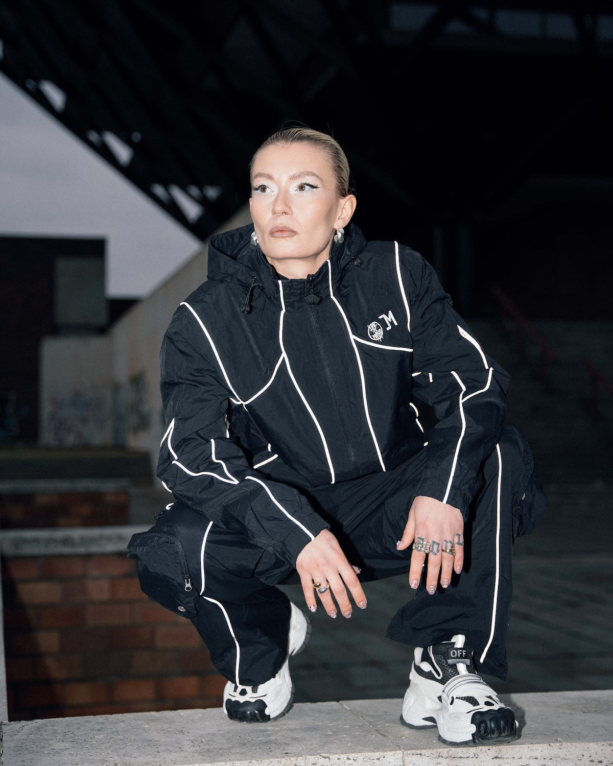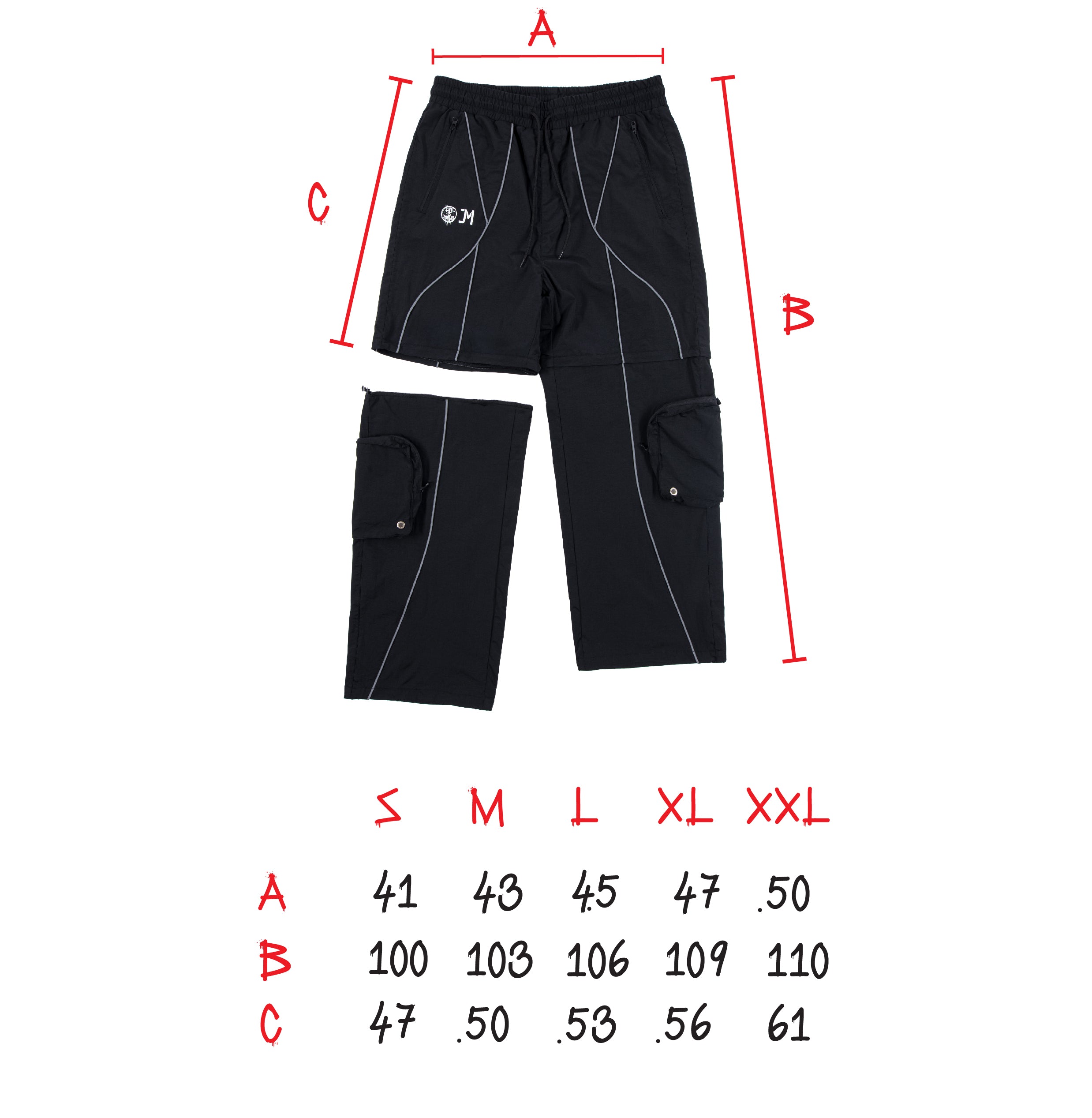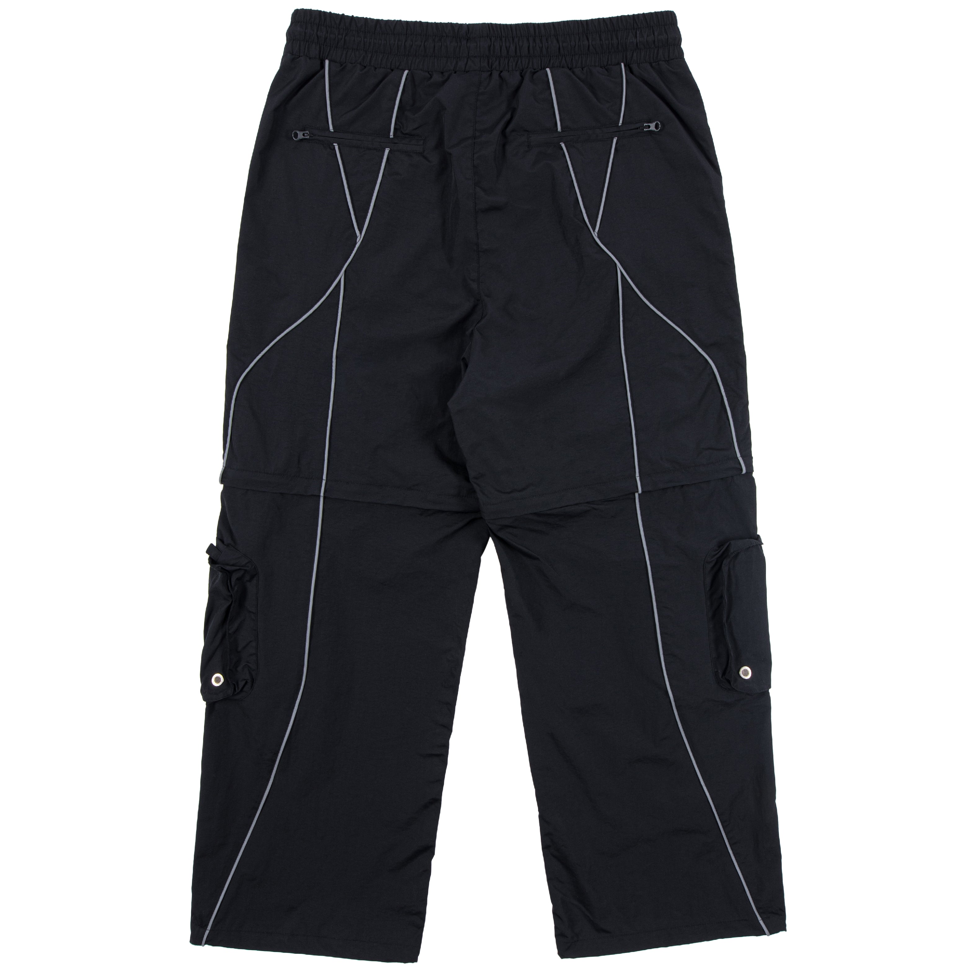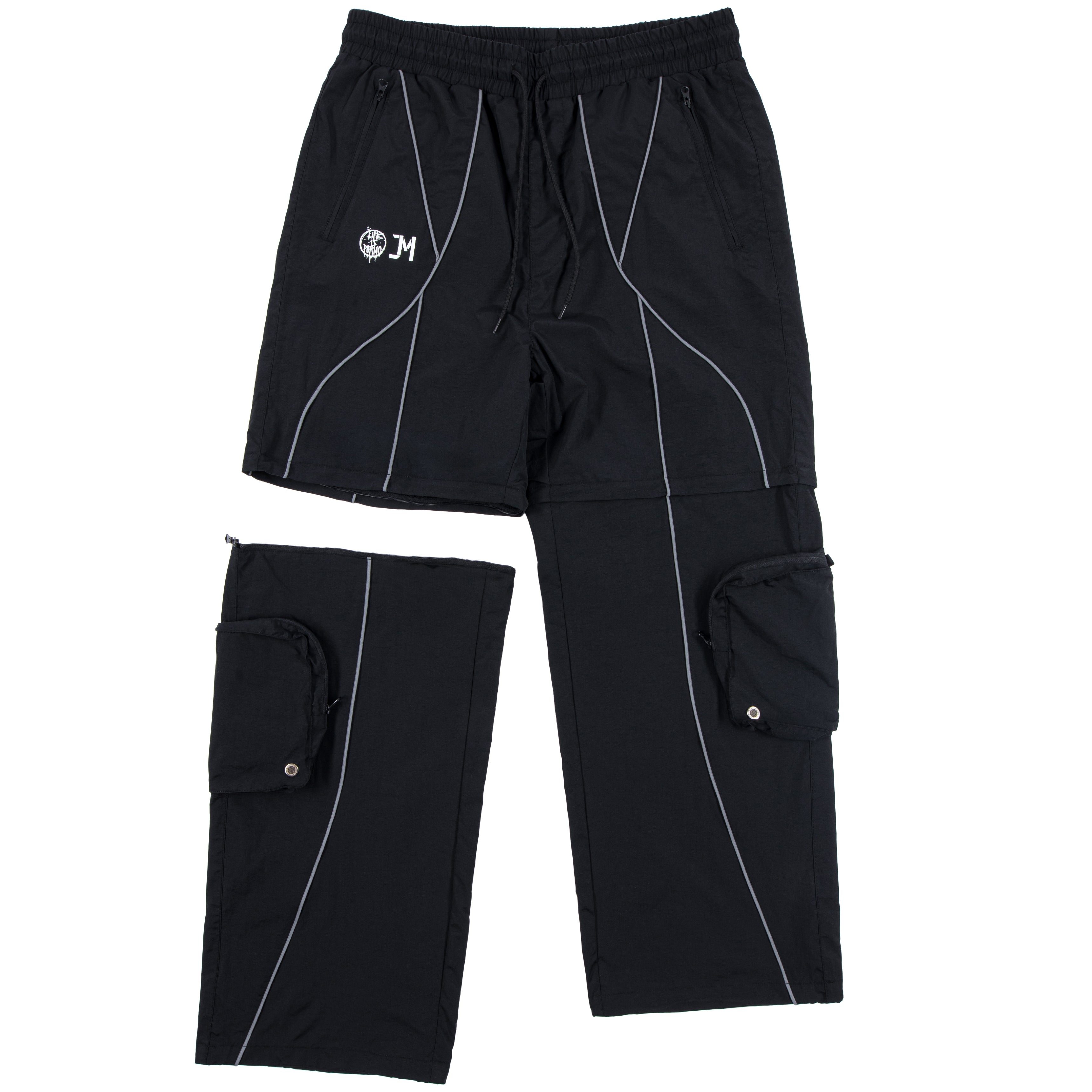 Reflexné pásiky, čo sú signature detail celej kolekcie, idú po bokoch až dole. A odrážajú svetlo aj tvoju originalitu. Materiál je nepremokavý šušťák podšitý sieťovinou. Stiahneš si ich v páse aj na nohaviciach a kapsy máš klasicky po stranách + cargo kapsy na zips na odopínateľnej časti.