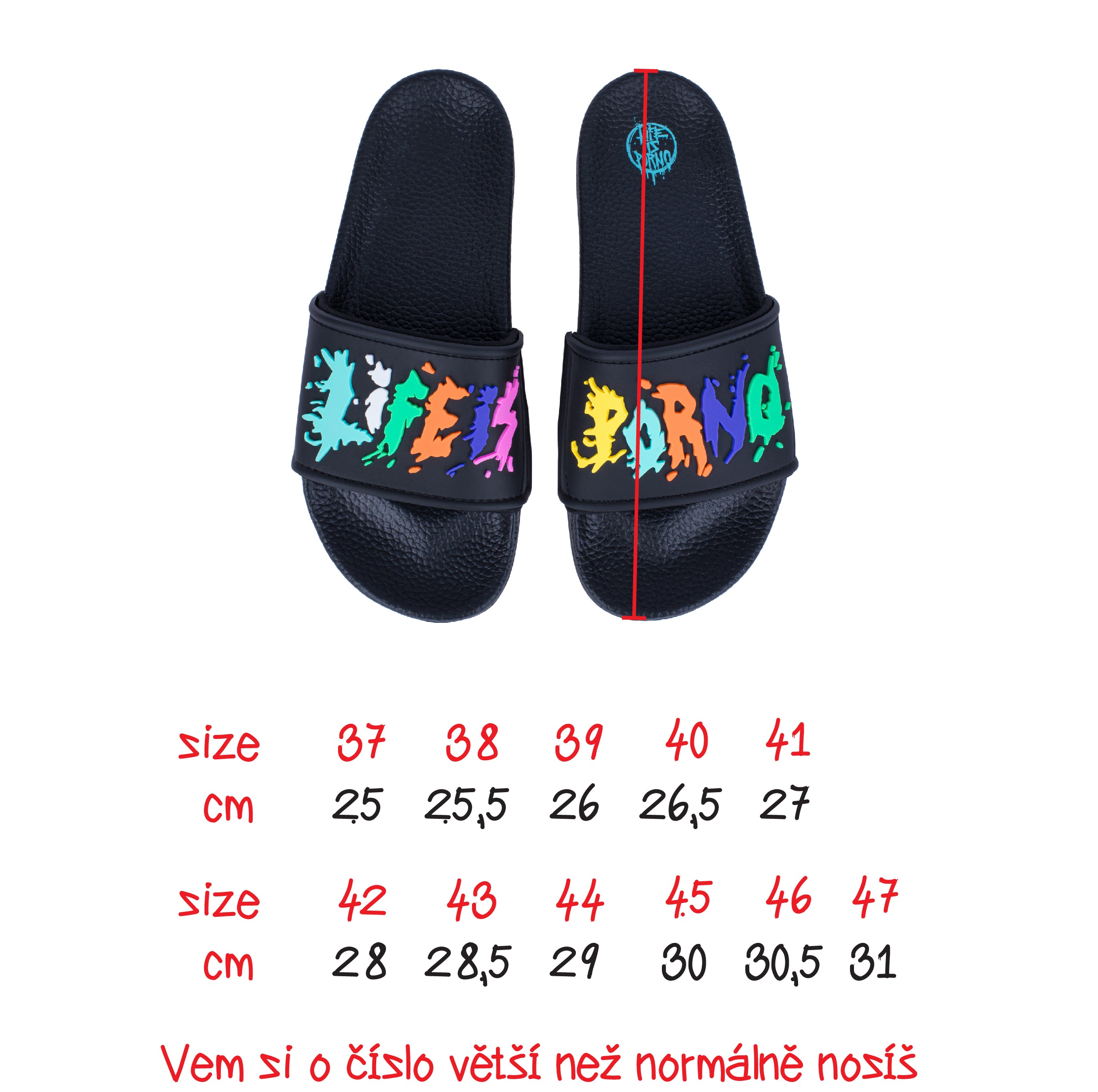 Na oboch Slides nájdeš 3D nápis „Life is Porno“ a ku každému páru ti pribalíme bavlnený pytlík vo fitting farbe.